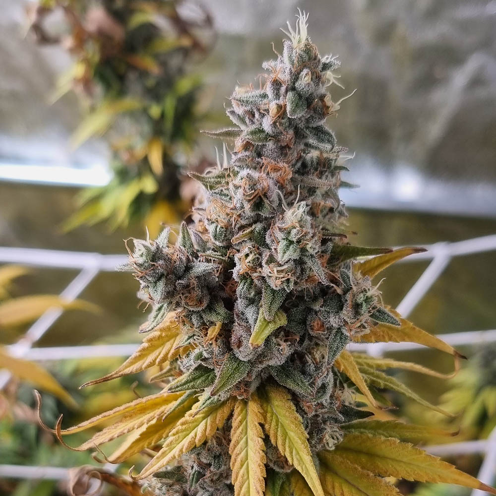 This striking cheese hybrid develops vivid yellows and greens as it enters flowering. The leaves resemble a tree in autumn, but the flowers bloom brightly with greens that border purple and plenty of trichomes to marvel at.